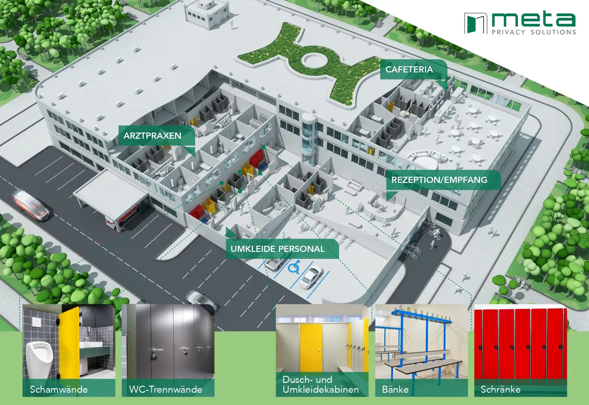 In sensiblen medizinischen Einrichtungen wie Krankenhäusern, Kliniken und Arztpraxen gelten besonders hohe Anforderungen an Hygiene, Sicherheit und Funktionalität. Unsere WC-Trennwände erfüllen diese Standards zuverlässig und bieten gleichzeitig Komfort für Patienten, Besucher und Personal.