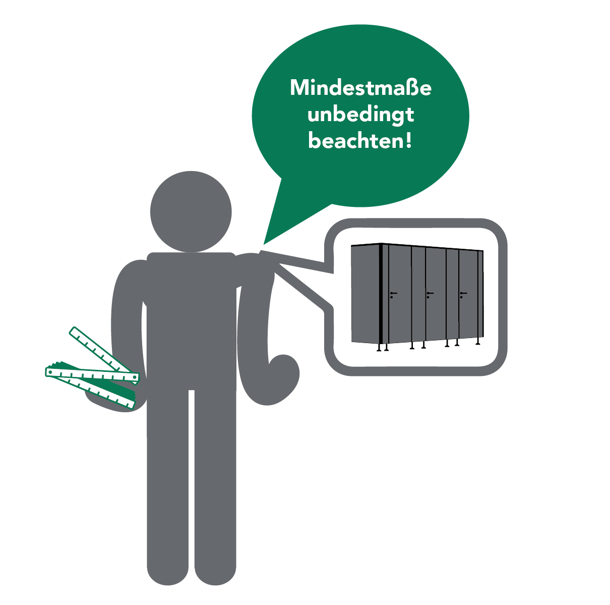 Gerne beraten wir Sie individuell zur barrierefreien und behindertengerechten Gestaltung Ihrer WC-Kabinen. Im Rahmen der Planung achten wir stets auf die erforderlichen Mindestmaße.