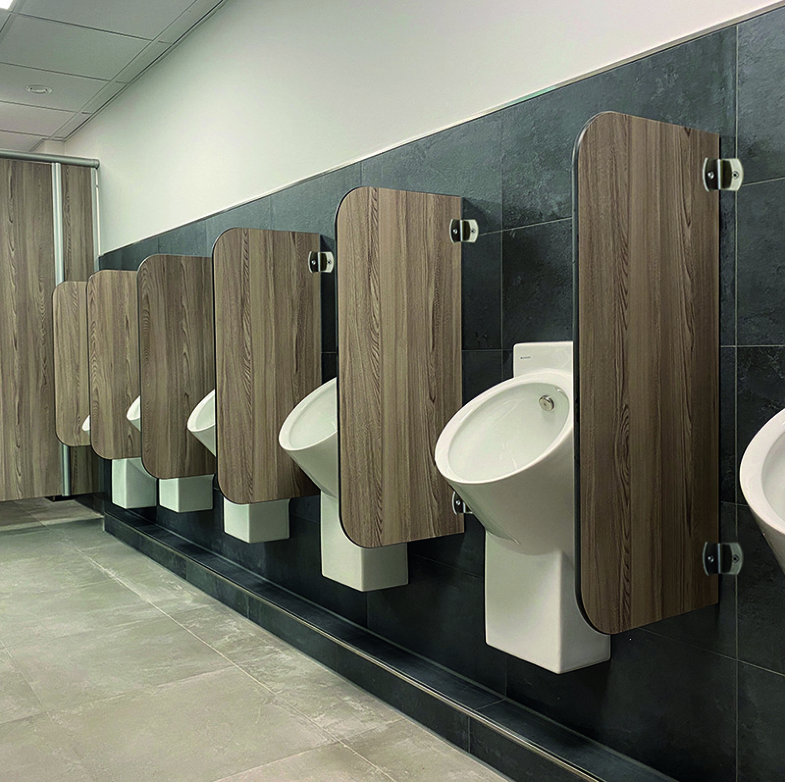 Aus dem gleichen Material wie die Vorderfront. Wandanschluss mit zwei pulverbeschichteten Schamwandhaltern. Unten ist die Schamwand mit einem Stützfuß am Boden befestigt.